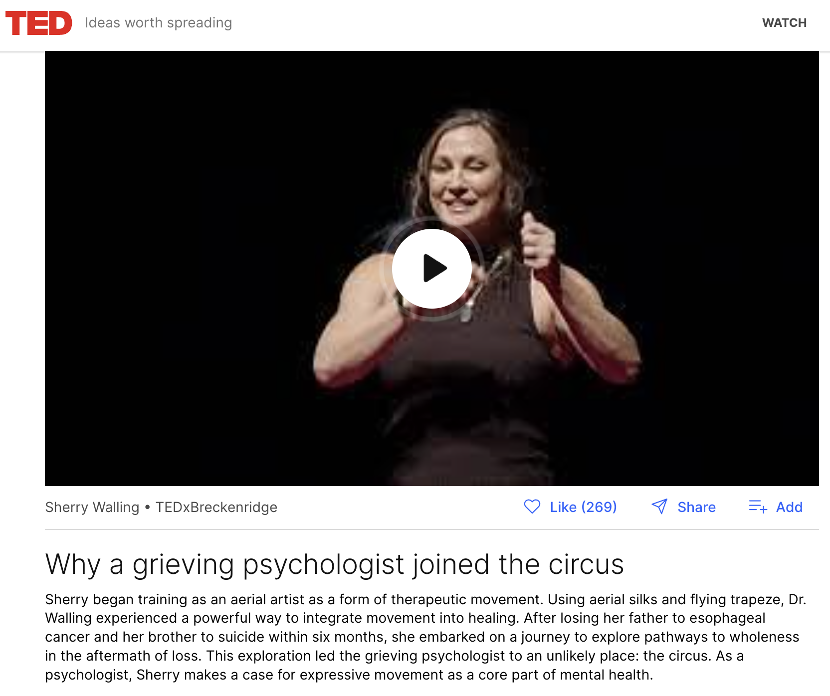 Watch Dr. Sherry and circus arts teacher Lynn Lunny on Minnesota’s local CBS affiliate. Both women tragically lost their brothers to suicide, and it was movement that helped them cope and manage their grief. Every May, to mark Mental Health Awareness month, they perform an original circus show.